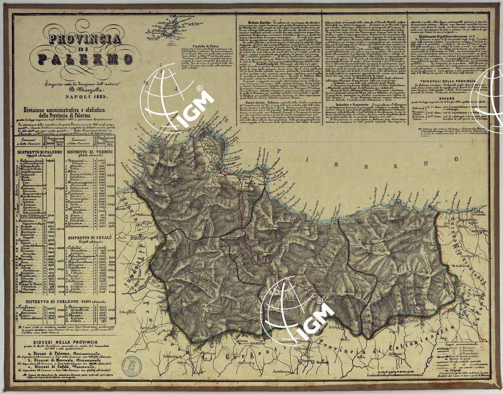 Carta in ventitre fogli montati su tela, stampati a colori in litografia, eseguiti sotto la direzione dell’autore B. Marzolla. Annesso un foglio d’insieme per il Regno delle Due Sicilie alla scala di 1:2.500.000 circa, su cui trovasi scritto: “Atlante geografico di B. Marzolla pubblicandosi ora da L. Manzella, Napoli 1859, nello Stabilimento Geografico”. Le carte distinguono a segni e colori i confini di stato, di provincia, di distretto, di circondario, di comune, le strade regie postali, rotabili, in costruzione, sentieri per cavalli e per pedoni, stazioni di posta, telegrafi. L’orografia è rappresentata col tratteggio a luce obliqua. Ciascun foglio contiene attorno al campo disegnato un quadro statistico-amministrativo, ed ampie notizie storiche e di geografia fisica ed economica: ognuno è distinto da un titolo particolare. Un documento analogo si trova al n. 128 d’inv. gen. appartenente alla Biblioteca (files B0001333-1356).