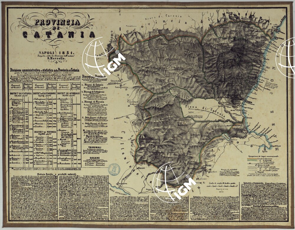 Carta in ventitre fogli montati su tela, stampati a colori in litografia, eseguiti sotto la direzione dell’autore B. Marzolla. Annesso un foglio d’insieme per il Regno delle Due Sicilie alla scala di 1:2.500.000 circa, su cui trovasi scritto: “Atlante geografico di B. Marzolla pubblicandosi ora da L. Manzella, Napoli 1859, nello Stabilimento Geografico”. Le carte distinguono a segni e colori i confini di stato, di provincia, di distretto, di circondario, di comune, le strade regie postali, rotabili, in costruzione, sentieri per cavalli e per pedoni, stazioni di posta, telegrafi. L’orografia è rappresentata col tratteggio a luce obliqua. Ciascun foglio contiene attorno al campo disegnato un quadro statistico-amministrativo, ed ampie notizie storiche e di geografia fisica ed economica: ognuno è distinto da un titolo particolare. Un documento analogo si trova al n. 128 d’inv. gen. appartenente alla Biblioteca (files B0001333-1356).