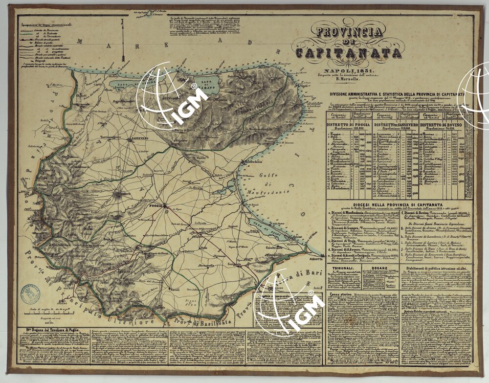 Carta in ventitre fogli montati su tela, stampati a colori in litografia, eseguiti sotto la direzione dell’autore B. Marzolla. Annesso un foglio d’insieme per il Regno delle Due Sicilie alla scala di 1:2.500.000 circa, su cui trovasi scritto: “Atlante geografico di B. Marzolla pubblicandosi ora da L. Manzella, Napoli 1859, nello Stabilimento Geografico”. Le carte distinguono a segni e colori i confini di stato, di provincia, di distretto, di circondario, di comune, le strade regie postali, rotabili, in costruzione, sentieri per cavalli e per pedoni, stazioni di posta, telegrafi. L’orografia è rappresentata col tratteggio a luce obliqua. Ciascun foglio contiene attorno al campo disegnato un quadro statistico-amministrativo, ed ampie notizie storiche e di geografia fisica ed economica: ognuno è distinto da un titolo particolare. Un documento analogo si trova al n. 128 d’inv. gen. appartenente alla Biblioteca (files B0001333-1356).