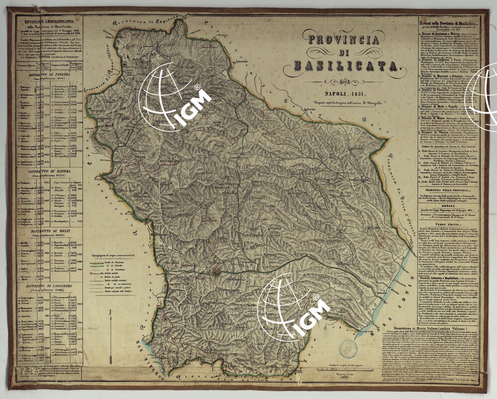 Carta in ventitre fogli montati su tela, stampati a colori in litografia, eseguiti sotto la direzione dell’autore B. Marzolla. Annesso un foglio d’insieme per il Regno delle Due Sicilie alla scala di 1:2.500.000 circa, su cui trovasi scritto: “Atlante geografico di B. Marzolla pubblicandosi ora da L. Manzella, Napoli 1859, nello Stabilimento Geografico”. Le carte distinguono a segni e colori i confini di stato, di provincia, di distretto, di circondario, di comune, le strade regie postali, rotabili, in costruzione, sentieri per cavalli e per pedoni, stazioni di posta, telegrafi. L’orografia è rappresentata col tratteggio a luce obliqua. Ciascun foglio contiene attorno al campo disegnato un quadro statistico-amministrativo, ed ampie notizie storiche e di geografia fisica ed economica: ognuno è distinto da un titolo particolare. Un documento analogo si trova al n. 128 d’inv. gen. appartenente alla Biblioteca (files B0001333-1356).