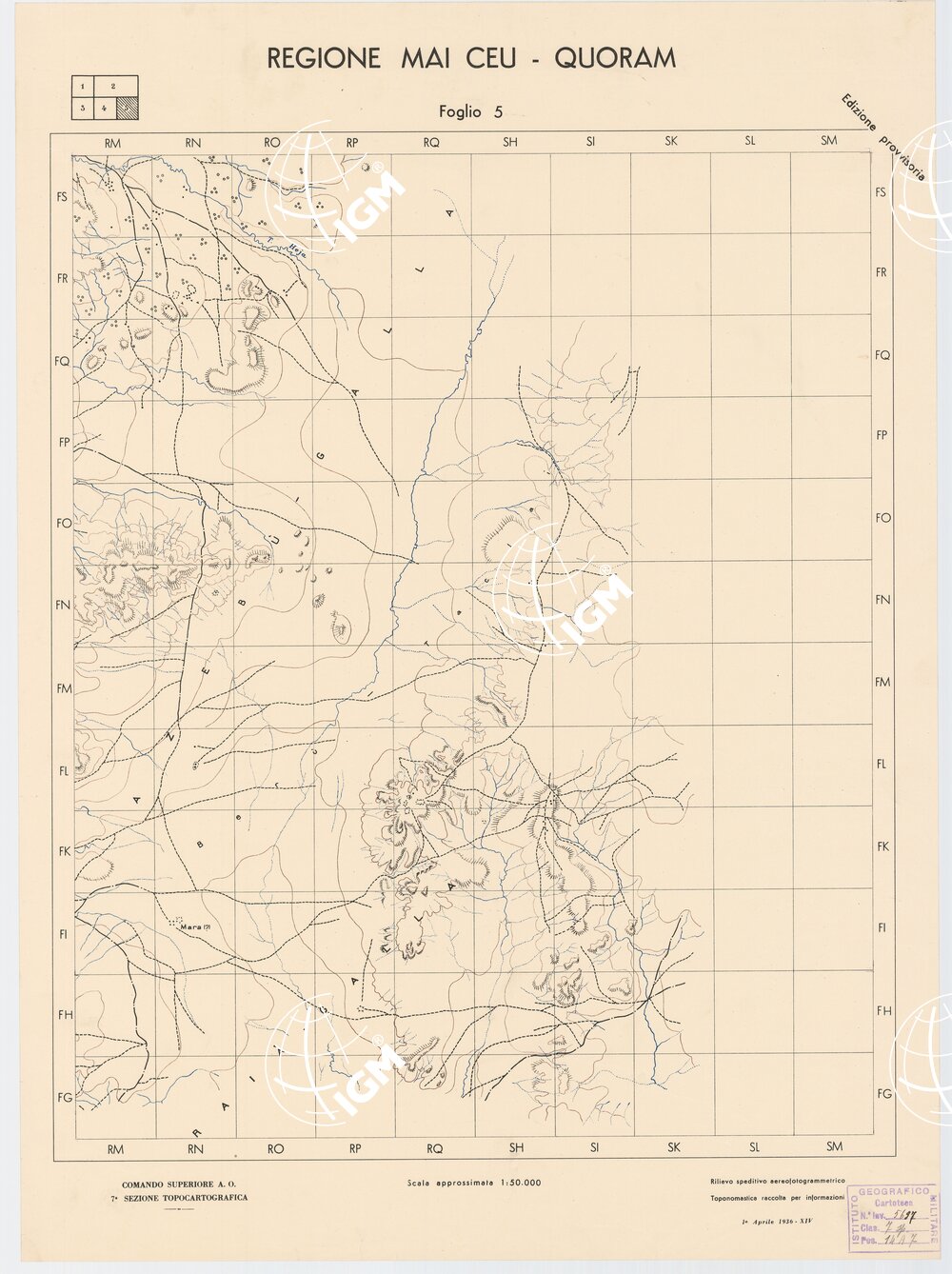 | Note foto | Autore Comando Superiore A.O.. – Settima sezione Topocartografica. Rilievo speditivo aereofotogrammetrico. La toponomastica è stata raccolta attraverso informazioni. |