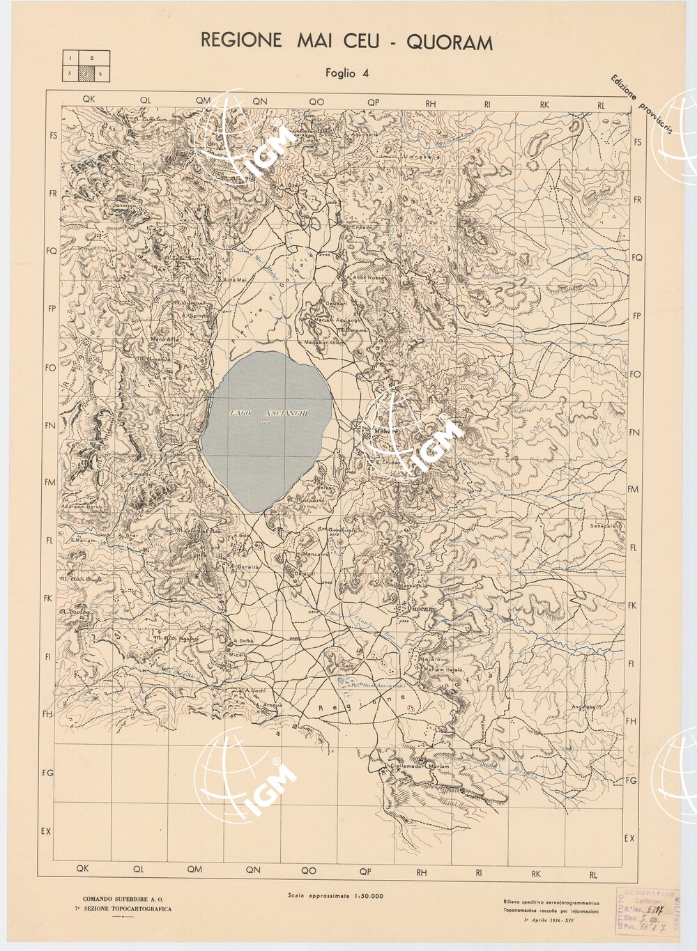 | Note foto | Autore Comando Superiore A.O.. – Settima sezione Topocartografica. Rilievo speditivo aereofotogrammetrico. La toponomastica è stata raccolta attraverso informazioni. |