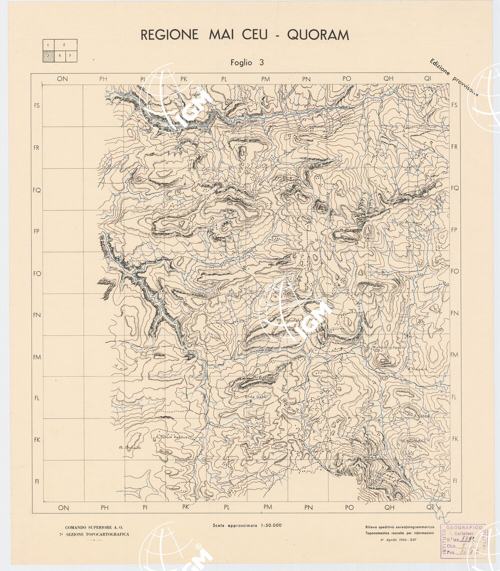 | Note foto | Autore Comando Superiore A.O.. – Settima sezione Topocartografica. Rilievo speditivo aereofotogrammetrico. La toponomastica è stata raccolta attraverso informazioni. |
