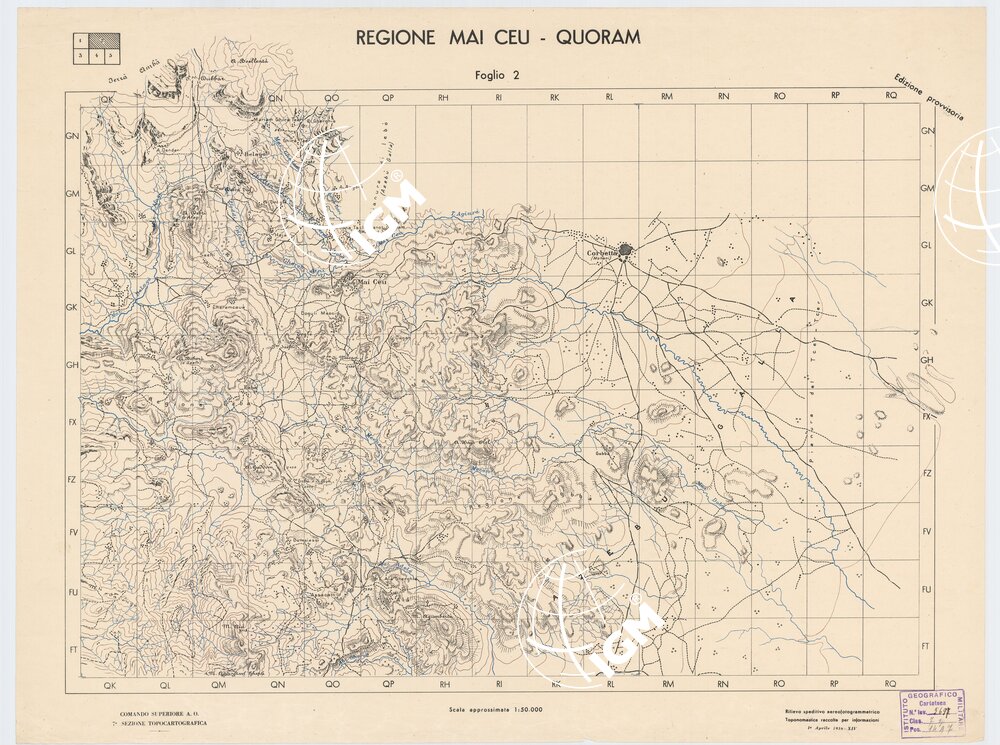 | Note foto | Autore Comando Superiore A.O.. – Settima sezione Topocartografica. Rilievo speditivo aereofotogrammetrico. La toponomastica è stata raccolta attraverso informazioni. |