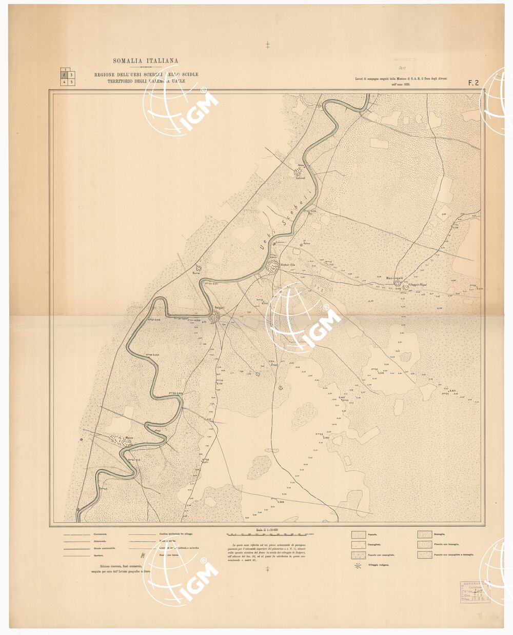 Riproduzione dei lavori di rilievo eseguiti dalla Missione di S.A.R. il Duca degli Abruzzi che esplorò il corso dell’Uebi Scebeli nell’anno 1920. La carta consta di quattro fogli interi e un mezzo foglio, stampati in azzurro, il fondo acque, ed in nero, il restante. Il corso dell’Uebi Scebeli è tracciato dal villaggio di Racheilo Omar Gudle a quella di Barre-Hauàdle. Per la viabilità si sono impiegati particolari segni a distinguere le carovaniere, le strade camionabili, i sentieri. Sono indicati i confini territoriali fra villaggio, i limiti di terreni coltivati o sciambe e i diversi tipi di vegetazione. Le quote furono riferite al piano orizzontale di paragone passante per l’estremità superiore del pilastrino c. s. n.11 situato sulla sponda sinistra del fiume a valle del villaggio di Balguri all’altezza di km. 36, con quota convenzionale + m. 10, e determinate mediante un livello a cannocchiale munito di circolo azimutale. La carta portò un grande contributo alla raffigurazione del corso dell’Uebi Scebeli. Della carta fu anche eseguita una riduzione in tre fogli al 20.000.