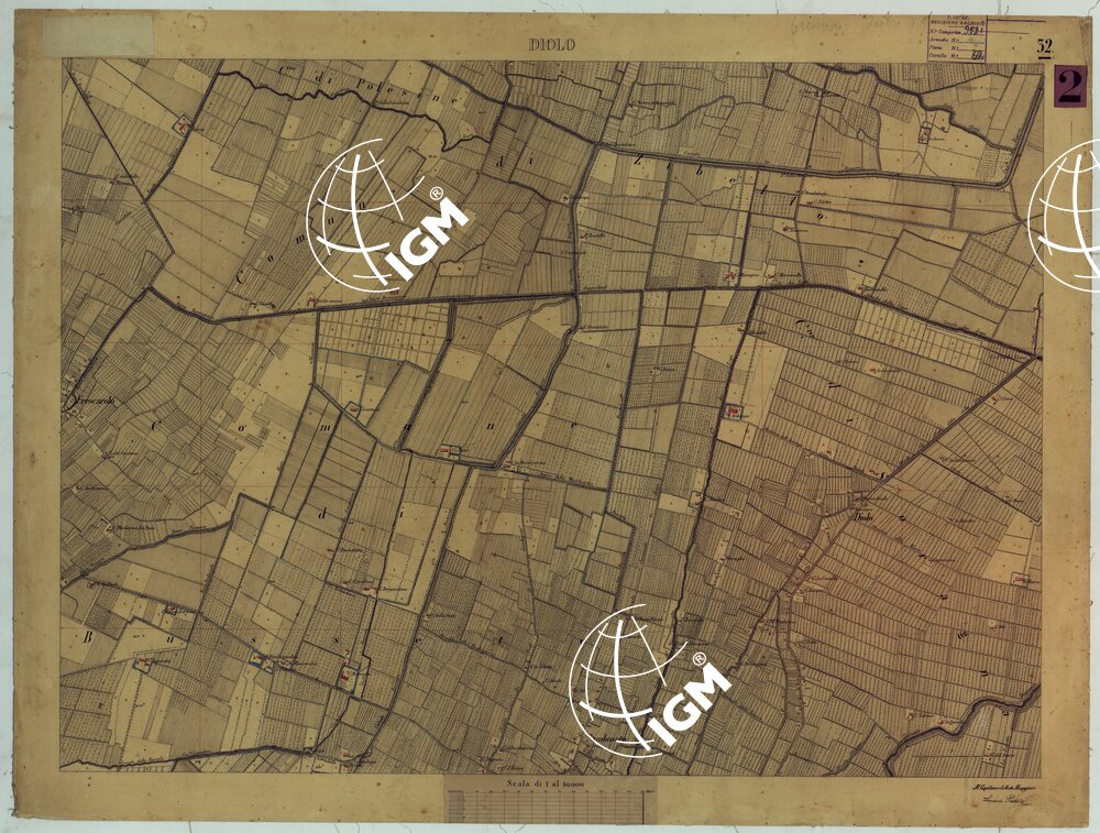 Trentasette tavolette montate su tela disegnate ad acquerello piu un quadro d’unione. Coprono la Valle Padana da Calendasco (ovest) a S. Daniele (est) e da Cavacurta (nord) a Busseto (sud). Le acque sono colorate in azzurro. Le costruzioni sono riempite in rosso. Ciascun foglio reca la data e il nome degli operatori. Varie di queste tavolette (Piacenza e dintorni) furono riconosciute nel 1880. (v. Cart. N° 62, Docum. N° 1). Annesso un piccolo quadro d’unione con elenco di tutti gli operatori.