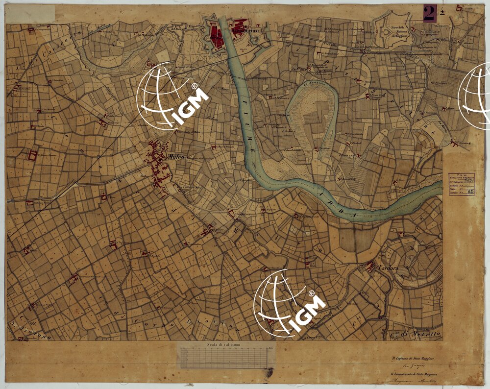 Trentasette tavolette montate su tela disegnate ad acquerello piu un quadro d’unione. Coprono la Valle Padana da Calendasco (ovest) a S. Daniele (est) e da Cavacurta (nord) a Busseto (sud). Le acque sono colorate in azzurro. Le costruzioni sono riempite in rosso. Ciascun foglio reca la data e il nome degli operatori. Varie di queste tavolette (Piacenza e dintorni) furono riconosciute nel 1880. (v. Cart. N° 62, Docum. N° 1). Annesso un piccolo quadro d’unione con elenco di tutti gli operatori.