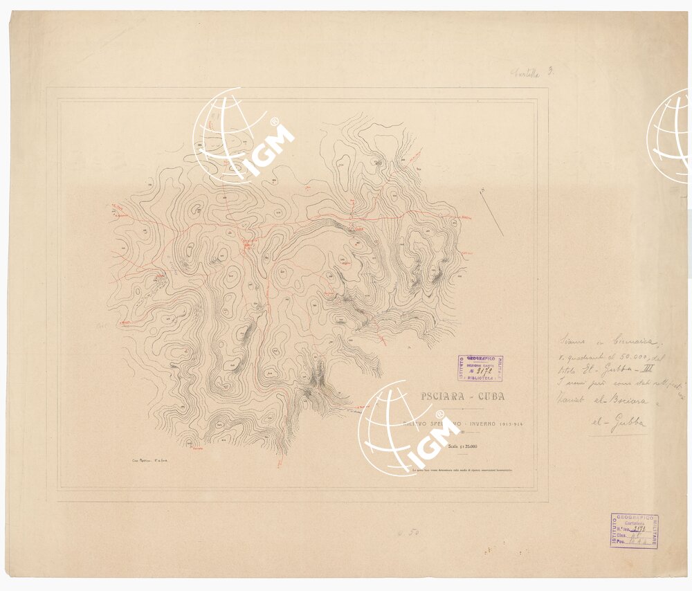 Rilievo eseguito dal cap. Fantino (2° di Fant.). Orografia a curve di livello in nero e quote altimetriche. La quota base fu determinata colla media di ripetute osservazioni barometriche. Le strade sono tracciate in rosso; le acque in azzurro. La carta rappresenta uno dei lavori parziali eseguiti da ufficiali dell’I.G.M. messi a disposizione del Comando del Corpo di operazioni durante l’occupazione della colonia.