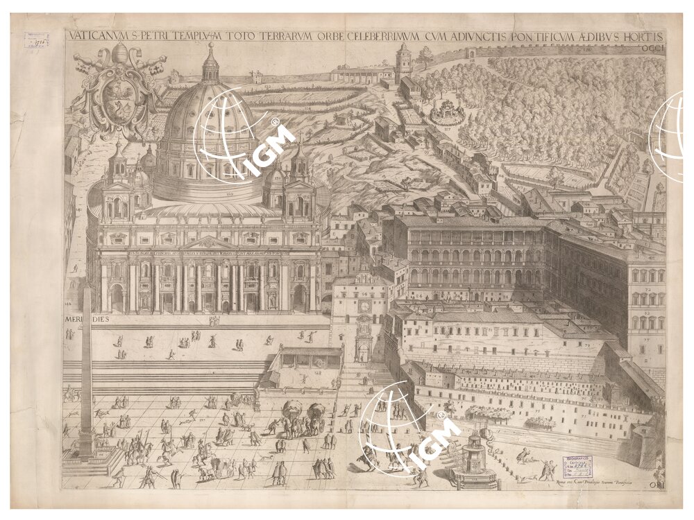 Cum adiunctis pontificum aedibus hortisq accurate delineatum ea omnia paulus v. pont max multis partibus amplificavit ornavitoque. E’ la grande veduta Maggi-Mascardi del 1615, del Tempio e del Palazzo Vaticano, riprodotta dai rami originali a cura della Biblioteca Vaticana (“Le Piante maggiori di Roma dei secoli XVI e XVII riprodotte in fototipia a cura della Biblioteca Vaticana”. Appendice N° 1) in due grandi fogli di m. 0,91×0,69. La riproduzione è accompagnata da un testo illustrativo a cura di Francesco Ehrle S. I. in cui vengono date notizie su gli autori della veduta, la data, la stamperia e vi è esaminato il contenuto di essa; vi sono inoltre riportate le leggende e l’elenco dei nomi.