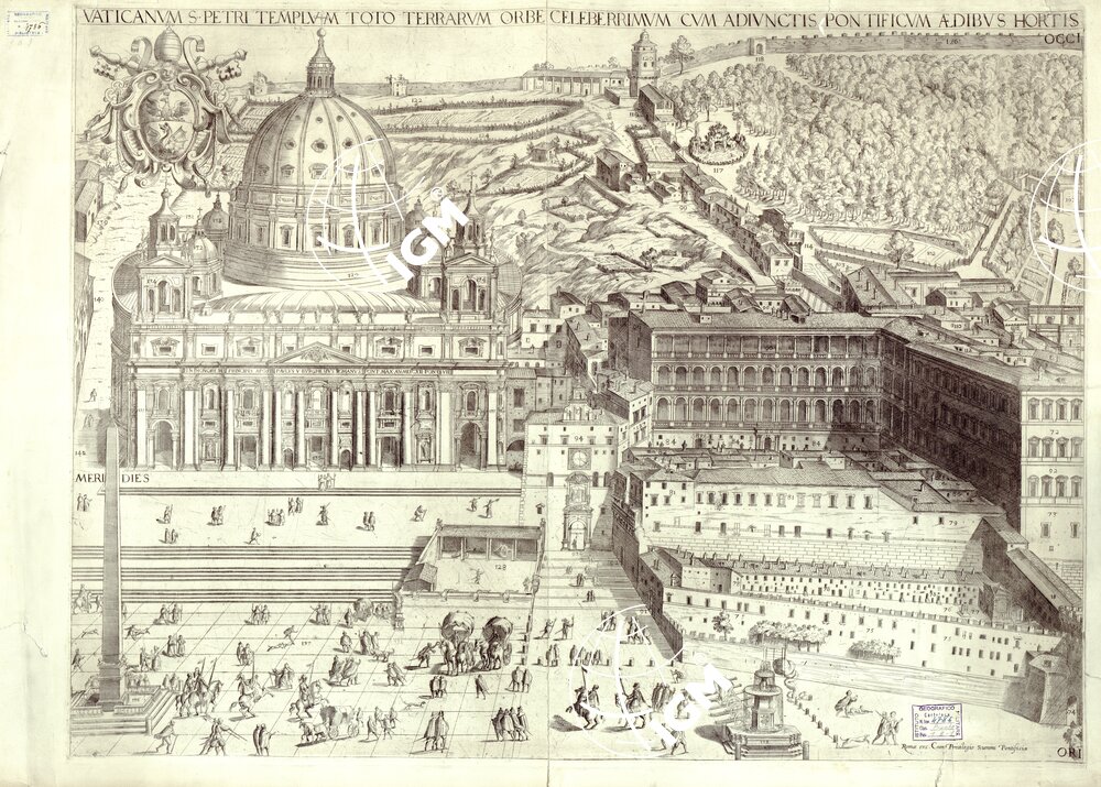 E’ la grande veduta Maggi-Mascardi del 1615, del Tempio e del Palazzo Vaticano, riprodotta dai rami originali a cura della Biblioteca Vaticana (“Le Piante maggiori di Roma dei secoli XVI e XVII riprodotte in fototipia a cura della Biblioteca Vaticana”, Appendice N° 1) in due grandi fogli. La riproduzione è accompagnata da un testo illustrativo a cura di Francesco Ehrle S. I. (Roma, Tipografia Poliglotta Vaticana 1914) in cui vengono date notizie su gli autori della veduta, la data, la stamperia e vi è esaminato il contenuto di essa; vi sono inoltre riportate le legende e l’elenco dei nomi.