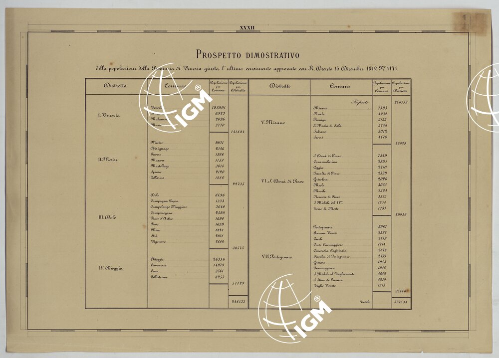 Carta in trentadue fogli notevoli per la chiarezza e nitidezza. Incisione su pietra. Stampa in nero. Distingue gli abitati in base alla loro importanza amministrativa; mostra le ferrovie, le strade (classificate in nazionali, provinciali e comunali), i confini di provincia, di distretto, di comune, ecc. I fogli N°I e V contengano il titolo, la scala e la leggenda dei segni convenzionali; il foglio N°11 reca il quadro d’unione. I fogli N° 16,20,23,24,28 contengano rispettivamente piante di Malamocco, Venezia (1:10.000), Chioggia, Mestre, Mirano, Dolo e S. Donà (8.000). Il foglio N°29 reca una “Tavola Poliometrica della Provincia di Venezia indicante la distanza da Comune a Comune, e di ciascun Comune del Capoluogo di Provincia” e il foglio N°32 un “Prospetto dimostrativo della popolazione della Provincia di Venezia giusta l’ultimo censimento approvato con R. decreto 15 Dicembre 1872″.2″..”..