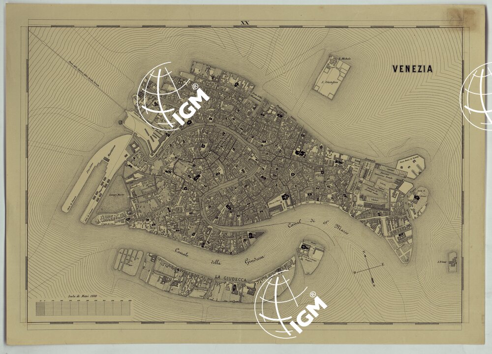 Carta in trentadue fogli notevoli per la chiarezza e nitidezza. Incisione su pietra. Stampa in nero. Distingue gli abitati in base alla loro importanza amministrativa; mostra le ferrovie, le strade (classificate in nazionali, provinciali e comunali), i confini di provincia, di distretto, di comune, ecc. I fogli N°I e V contengano il titolo, la scala e la leggenda dei segni convenzionali; il foglio N°11 reca il quadro d’unione. I fogli N° 16,20,23,24,28 contengano rispettivamente piante di Malamocco, Venezia (1:10.000), Chioggia, Mestre, Mirano, Dolo e S. Donà (8.000). Il foglio N°29 reca una “Tavola Poliometrica della Provincia di Venezia indicante la distanza da Comune a Comune, e di ciascun Comune del Capoluogo di Provincia” e il foglio N°32 un “Prospetto dimostrativo della popolazione della Provincia di Venezia giusta l’ultimo censimento approvato con R. decreto 15 Dicembre 1872″.2”..