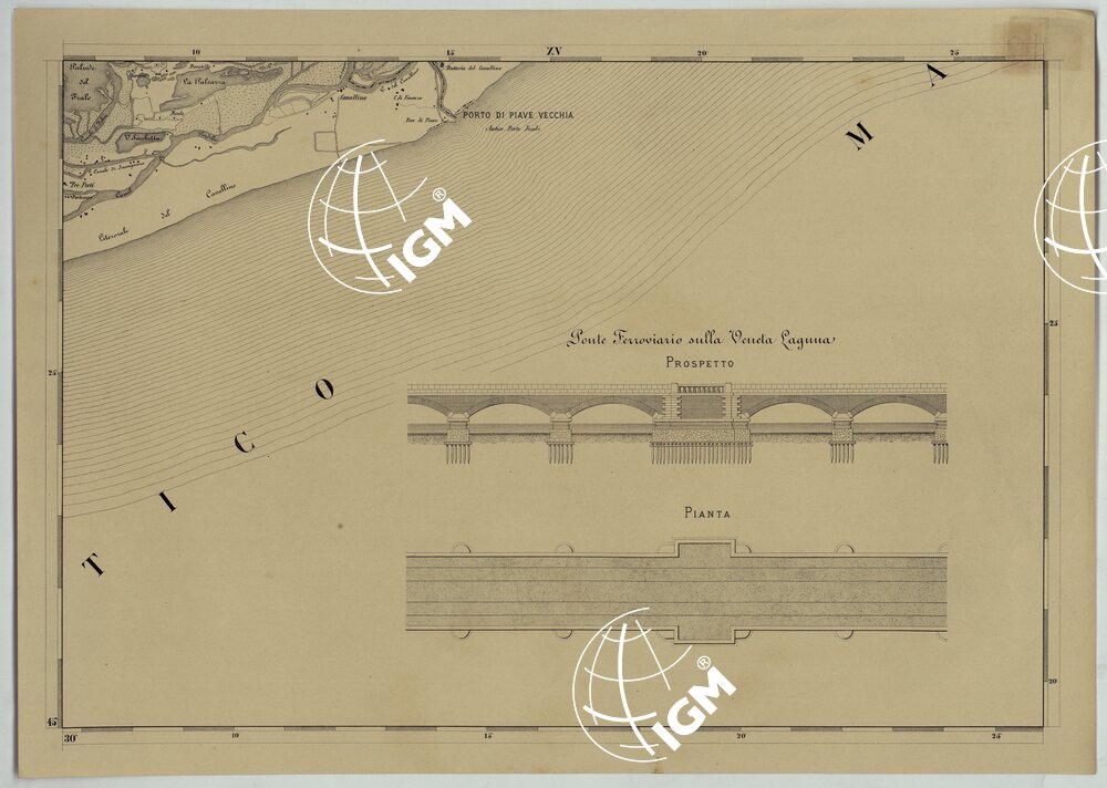 Carta in trentadue fogli notevoli per la chiarezza e nitidezza. Incisione su pietra. Stampa in nero. Distingue gli abitati in base alla loro importanza amministrativa; mostra le ferrovie, le strade (classificate in nazionali, provinciali e comunali), i confini di provincia, di distretto, di comune, ecc. I fogli N°I e V contengano il titolo, la scala e la leggenda dei segni convenzionali; il foglio N°11 reca il quadro d’unione. I fogli N° 16,20,23,24,28 contengano rispettivamente piante di Malamocco, Venezia (1:10.000), Chioggia, Mestre, Mirano, Dolo e S. Donà (8.000). Il foglio N°29 reca una “Tavola Poliometrica della Provincia di Venezia indicante la distanza da Comune a Comune, e di ciascun Comune del Capoluogo di Provincia” e il foglio N°32 un “Prospetto dimostrativo della popolazione della Provincia di Venezia giusta l’ultimo censimento approvato con R. decreto 15 Dicembre 1872″.2″..”..