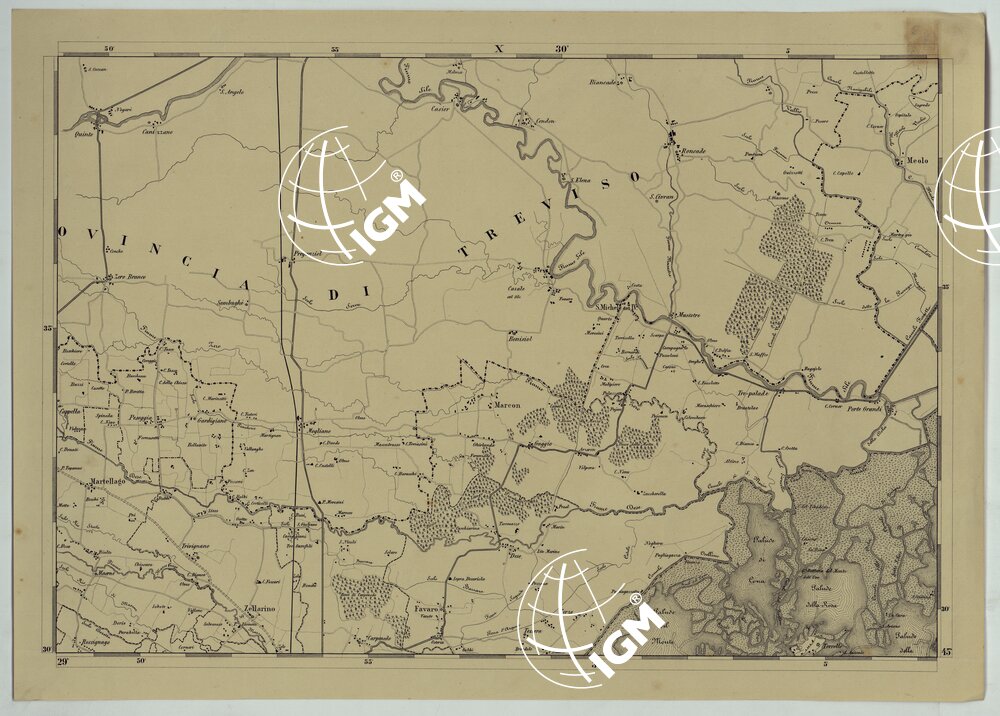 Carta in trentadue fogli notevoli per la chiarezza e nitidezza. Incisione su pietra. Stampa in nero. Distingue gli abitati in base alla loro importanza amministrativa; mostra le ferrovie, le strade (classificate in nazionali, provinciali e comunali), i confini di provincia, di distretto, di comune, ecc. I fogli N°I e V contengano il titolo, la scala e la leggenda dei segni convenzionali; il foglio N°11 reca il quadro d’unione. I fogli N° 16,20,23,24,28 contengano rispettivamente piante di Malamocco, Venezia (1:10.000), Chioggia, Mestre, Mirano, Dolo e S. Donà (8.000). Il foglio N°29 reca una “Tavola Poliometrica della Provincia di Venezia indicante la distanza da Comune a Comune, e di ciascun Comune del Capoluogo di Provincia” e il foglio N°32 un “Prospetto dimostrativo della popolazione della Provincia di Venezia giusta l’ultimo censimento approvato con R. decreto 15 Dicembre 1872”.