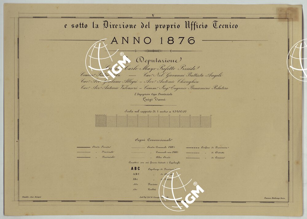 Carta in trentadue fogli notevoli per la chiarezza e nitidezza. Incisione su pietra. Stampa in nero. Distingue gli abitati in base alla loro importanza amministrativa; mostra le ferrovie, le strade (classificate in nazionali, provinciali e comunali), i confini di provincia, di distretto, di comune, ecc. I fogli N°I e V contengano il titolo, la scala e la leggenda dei segni convenzionali; il foglio N°11 reca il quadro d’unione. I fogli N° 16,20,23,24,28 contengano rispettivamente piante di Malamocco, Venezia (1:10.000), Chioggia, Mestre, Mirano, Dolo e S. Donà (8.000). Il foglio N°29 reca una “Tavola Poliometrica della Provincia di Venezia indicante la distanza da Comune a Comune, e di ciascun Comune del Capoluogo di Provincia” e il foglio N°32 un “Prospetto dimostrativo della popolazione della Provincia di Venezia giusta l’ultimo censimento approvato con R. decreto 15 Dicembre 1872”.