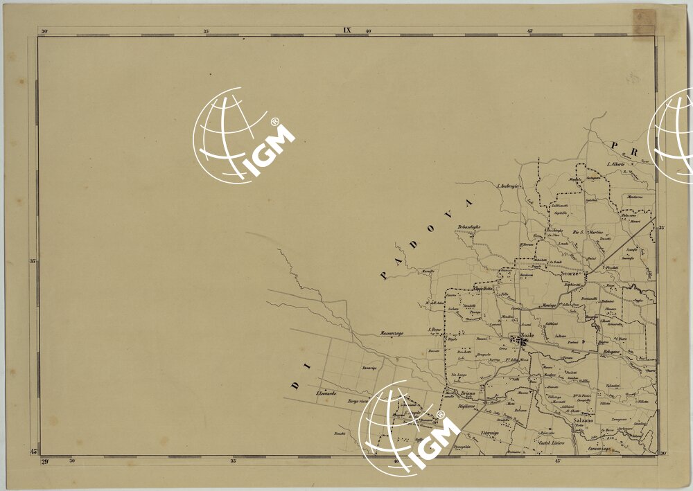Carta in trentadue fogli notevoli per la chiarezza e nitidezza. Incisione su pietra. Stampa in nero. Distingue gli abitati in base alla loro importanza amministrativa; mostra le ferrovie, le strade (classificate in nazionali, provinciali e comunali), i confini di provincia, di distretto, di comune, ecc. I fogli N°I e V contengano il titolo, la scala e la leggenda dei segni convenzionali; il foglio N°11 reca il quadro d’unione. I fogli N° 16,20,23,24,28 contengano rispettivamente piante di Malamocco, Venezia (1:10.000), Chioggia, Mestre, Mirano, Dolo e S. Donà (8.000). Il foglio N°29 reca una “Tavola Poliometrica della Provincia di Venezia indicante la distanza da Comune a Comune, e di ciascun Comune del Capoluogo di Provincia” e il foglio N°32 un “Prospetto dimostrativo della popolazione della Provincia di Venezia giusta l’ultimo censimento approvato con R. decreto 15 Dicembre 1872”.