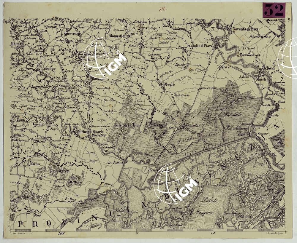 TOPOGRAFIA DELLA PROVINCIA DI TREVISO PER OPERA DELL’ING. ARCH. CIV. D’AGOSTINO CASSINIS MEDIANTE LA FOTOGRAFIA DALLA CARTE DELL’ISTITUTO GEOG. MILIT. DI VIENNA TRADOTTA IN SCALA DI 1 43,200 E RETTIFICATA SECONDO LE VARIAZIONI AVVENUTE FINO AL 1876.