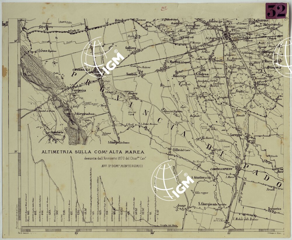 Carta in sedici fogli in litografia da ingrandimento fotografico della carta austriaca alla scala di 1:86.400. A seguito del titolo (foglio 1) è detto: “Le indicazioni geologiche sono del prof. Taramelli Torquato, quali risultano dalle carte premiate all’esposizione Reg. di Treviso (1872) sulla pubblicazione delle quali indicazioni l’autore dichiara riservarsi la proprietà ed i diritti concessi dalle vigenti leggi”. Il foglio N°4 della carta è infatti una carta geologica a sè: esso reca il titolo “Topografia in scala di 1:162.000 della Provincia di Treviso come quadro sinottico formante parte della Grande carta Topografica dedotta fotograficamente come questa e mostra con segni e colori la serie cronogeologica”. Altre spiegazioni e notizie si trovano nei fogli N°1 e 8. Il foglio N°3 contiene la pianta di Treviso alla scala di 1:10.000 con elenco numerico degli edifici principali. I fogli N°12 e 16 recano una “Tabella idrografica industriale della Provincia di Treviso”. I fogli sono contenuti entro una copertina sulla quale sono dati cenni informativi sulla costruzione della carta stessa. Annessi un quadro sinottico della Provincia di Treviso con dati statistico amministrativi, un foglio con “Schiarimenti ad alcune voci mancanti nei comuni dizionari ed usate nella illustrazione Geologica dell Trevigiana”. e una “Tabella delle principali qualità di pietre e terre esistenti in provincia di Treviso per usi d’arti ed industrie”.