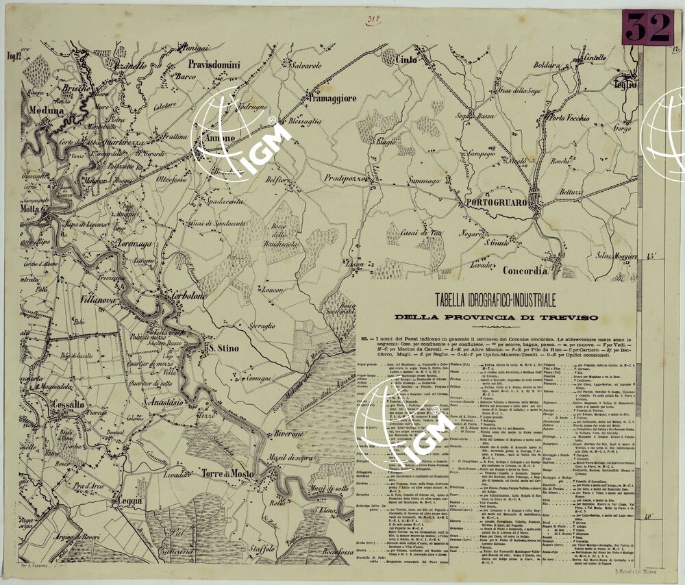 Carta in sedici fogli in litografia da ingrandimento fotografico della carta austriaca alla scala di 1:86.400. A seguito del titolo (foglio 1) è detto: “Le indicazioni geologiche sono del prof. Taramelli Torquato, quali risultano dalle carte premiate all’esposizione Reg. di Treviso (1872) sulla pubblicazione delle quali indicazioni l’autore dichiara riservarsi la proprietà ed i diritti concessi dalle vigenti leggi”. Il foglio N°4 della carta è infatti una carta geologica a sè: esso reca il titolo “Topografia in scala di 1:162.000 della Provincia di Treviso come quadro sinottico formante parte della Grande carta Topografica dedotta fotograficamente come questa e mostra con segni e colori la serie cronogeologica”. Altre spiegazioni e notizie si trovano nei fogli N°1 e 8. Il foglio N°3 contiene la pianta di Treviso alla scala di 1:10.000 con elenco numerico degli edifici principali. I fogli N°12 e 16 recano una “Tabella idrografica industriale della Provincia di Treviso”. I fogli sono contenuti entro una copertina sulla quale sono dati cenni informativi sulla costruzione della carta stessa. Annessi un quadro sinottico della Provincia di Treviso con dati statistico amministrativi, un foglio con “Schiarimenti ad alcune voci mancanti nei comuni dizionari ed usate nella illustrazione Geologica dell Trevigiana”. e una “Tabella delle principali qualità di pietre e terre esistenti in provincia di Treviso per usi d’arti ed industrie”.