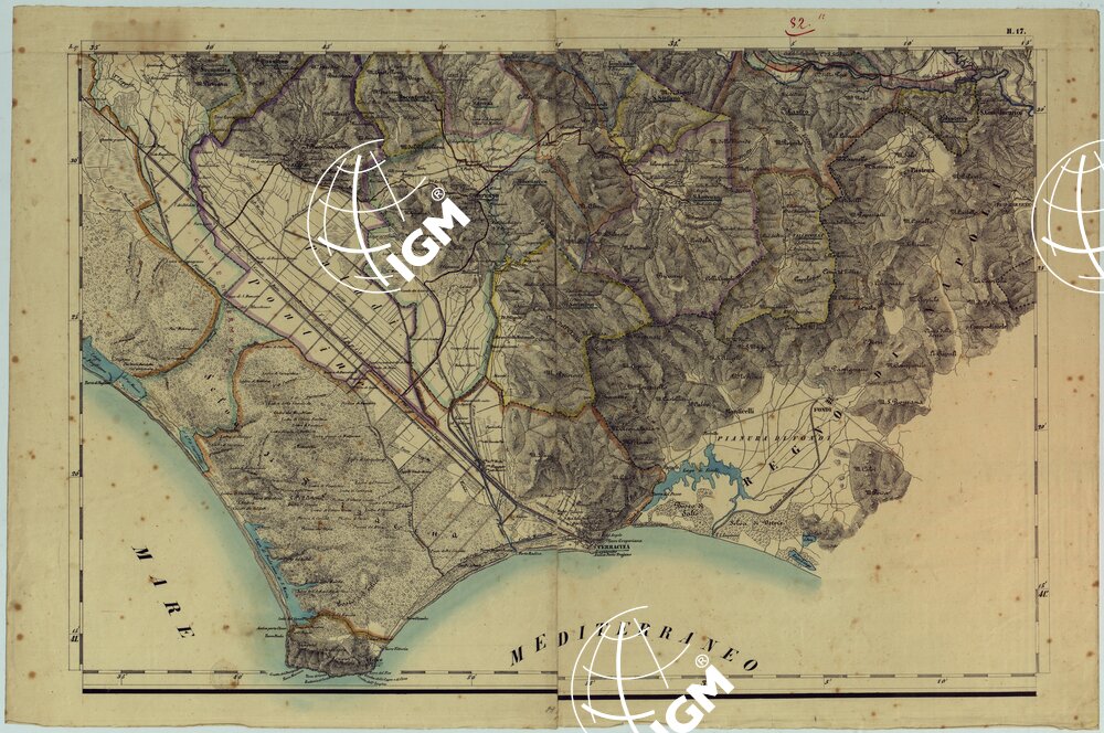 Dodici fogli estendetisi da Radicofoni (nord) a Terracina (sud) e dal Lago di Fucino (est) al Monte Argentario (ovest). Riproduzione autografica con colori a mano per le circoscrizioni. Uno dei fogli contiene un prospetto di quote altimetriche di vari punti trigonometrici nel Granducato di Toscana.