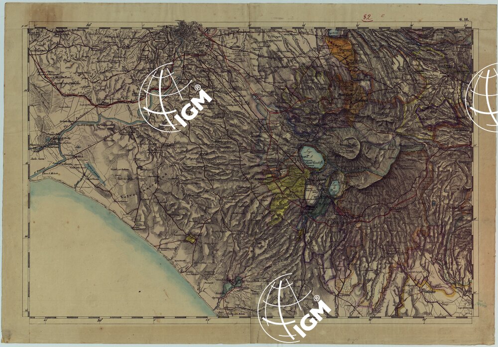 Dodici fogli estendentisi da Radicofani (nord) a Terracina (sud) e dal Lago di Fucino (est) al Monte Argentario (ovest). Riproduzione autografica con colori a mano per le circoscrizioni. Uno dei fogli contiene un prospetto di quote altimetriche di vari punti trigonometrici. nel Granducato di Toscana.