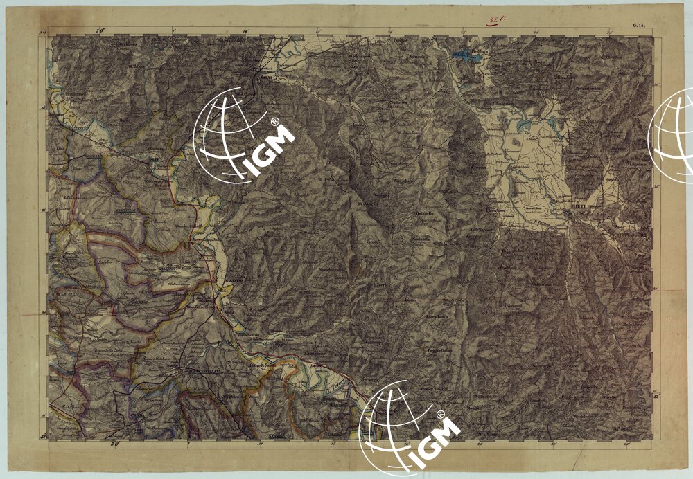Dodici fogli estendentisi da Radicofani (nord) a Terracina (sud) e dal Lago di Fucino (est) al Monte Argentario (ovest). Riproduzione autografica con colori a mano per le circoscrizioni. Uno dei fogli contiene un prospetto di quote altimetriche di vari punti trigonometrici nel Granducato di Toscana.
