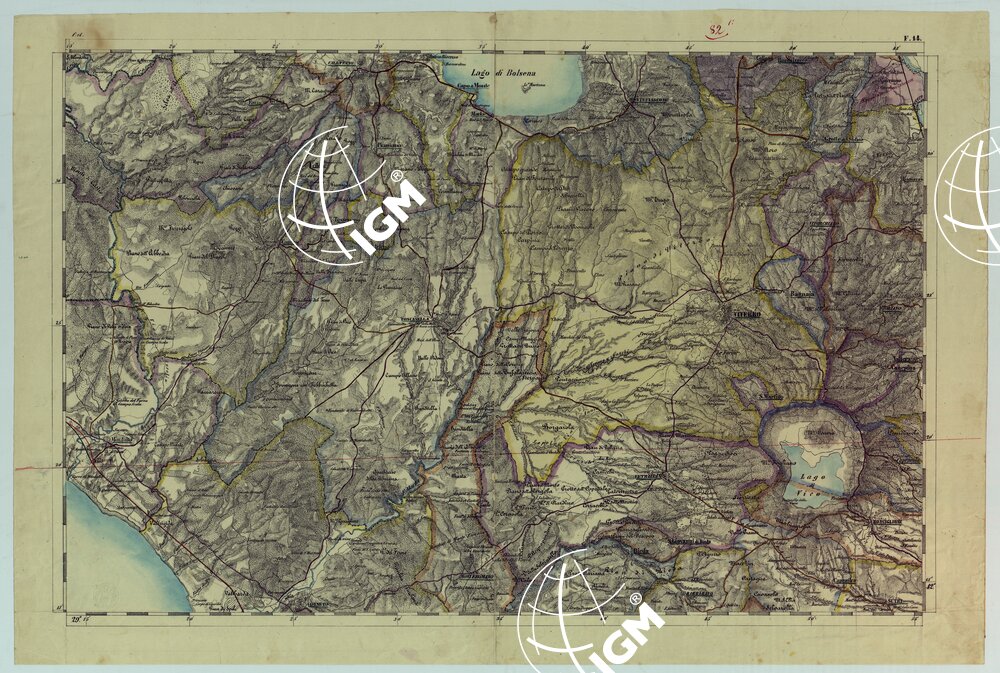 Dodici fogli estendentisi da Radicofani (nord) a Terracina (sud) e dal Lago di Fucino (est) al Monte Argentario (ovest). Riproduzione autografica con colori a mano per le circoscrizioni. Uno dei fogli contiene un prospetto di quote altimetriche di vari punti trigonometrici nel Granducato di Toscana.