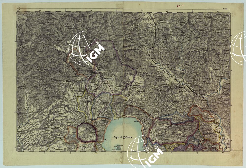 Dodici fogli estendentisi da Radicofoni (nord) a Terracina (sud) e dal Lago di Fucino (est) al Monte Argentario (ovest). Riproduzione autografica con colori a mano per le circoscrizioni. Uno dei fogli contiene un prospetto di quote altimetriche di vari punti trigonometrici nel Granducato di Toscana.