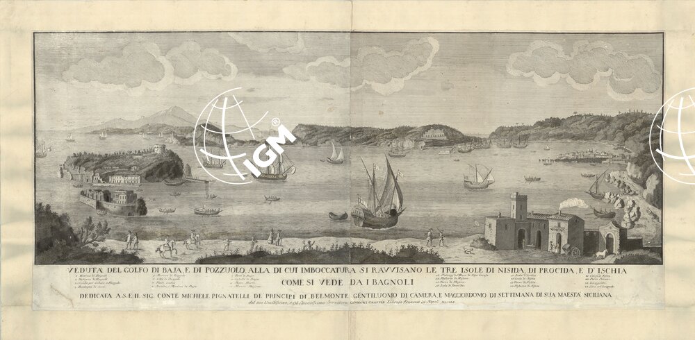 Veduta ALLA CUI IMBOCCATURA SI RAVVISANO LE TRE ISOLE DI NISIDA,PROCIDA E D’ISCHIA COME SI VEDE DA I BAGNOLI. DEDICATA A. S. E. IL SIGNOR CONTE MICHELE PIGNATELLI DE PRINCIPI DI BELMONTE GENTILUOMO DI CAMERA E MAGGIORDOMO DI SETTIMANA DI SUA MAESTA’ SICILIANA. DAL SUO SERVILISSIMO E OBBEDIENTISSIMO SERVITORE GIOVANNI GRAVIER LIBRAIO FRANCESE IN NAPOLI. MDCCLX.