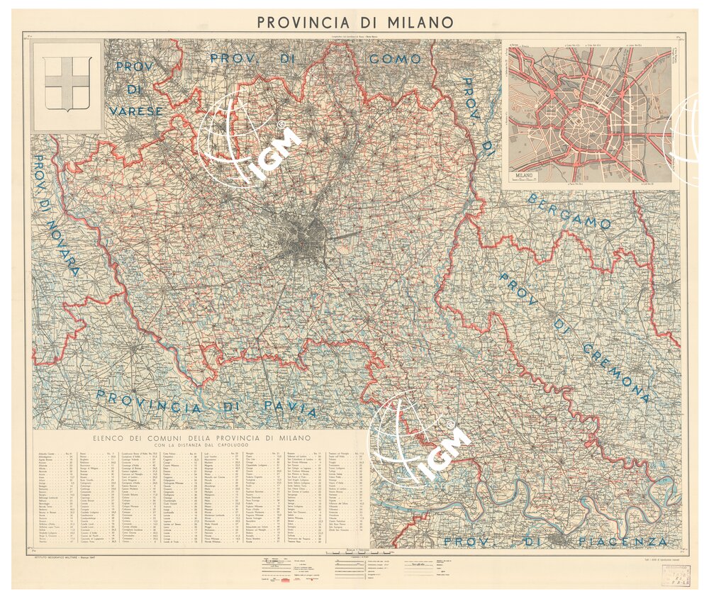Rappresentazione orografica a curve di livello e sfumo, l’equidistanza è di 50 metri. In basso è presente l’elenco dei comuni della provincia di Milano con la distanza dal capoluogo. In alto a destra c’è un riquadro dove è rappresentata la pianta della città di Milano. I.G.M. (FI).