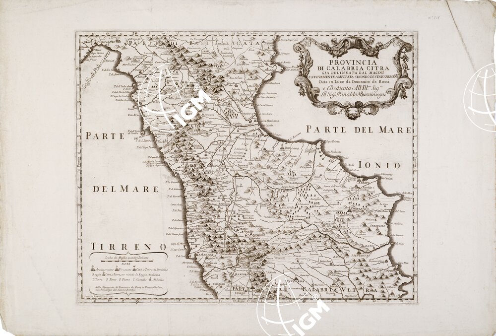 PROVINCIA DI CALABRIA CITRA GIA’ DELINEATA DAL MAGINI E NUOVAMENTE AMPLIATA SECONDO LO STATO PRESENTE DATA IN LUCE DA DOMENICO DE ROSSI E DEDICATA ALL’ILLUSTRISSIMO SIGNORE DOMENICO IL SIGNORE RINALDO BUONINSEGNI etc…