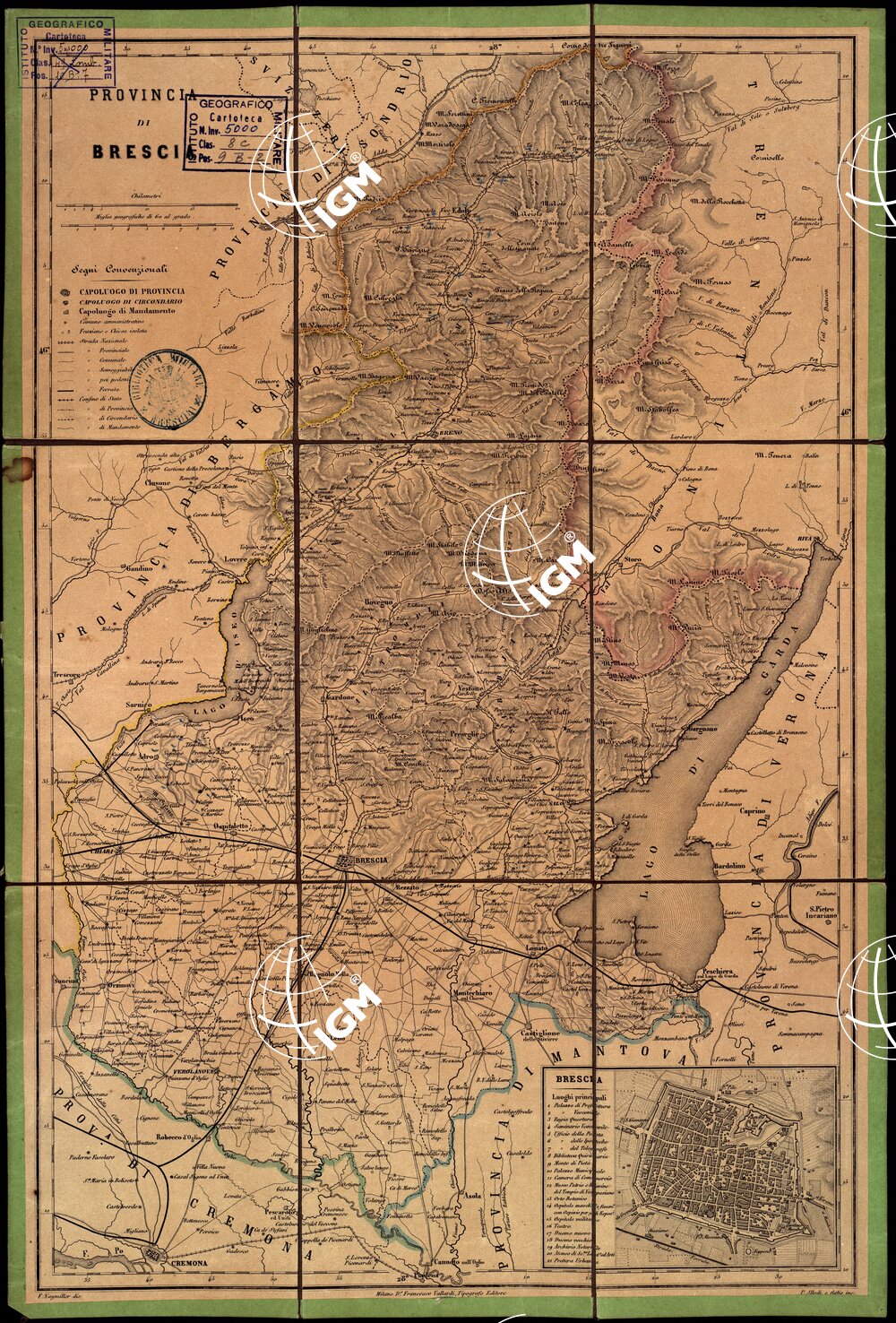 Rappresentazione orografica a tratteggio; sotto il titolo vi è la legenda dei segni convenzionali, in basso a destra è presente la pianta di Brescia.