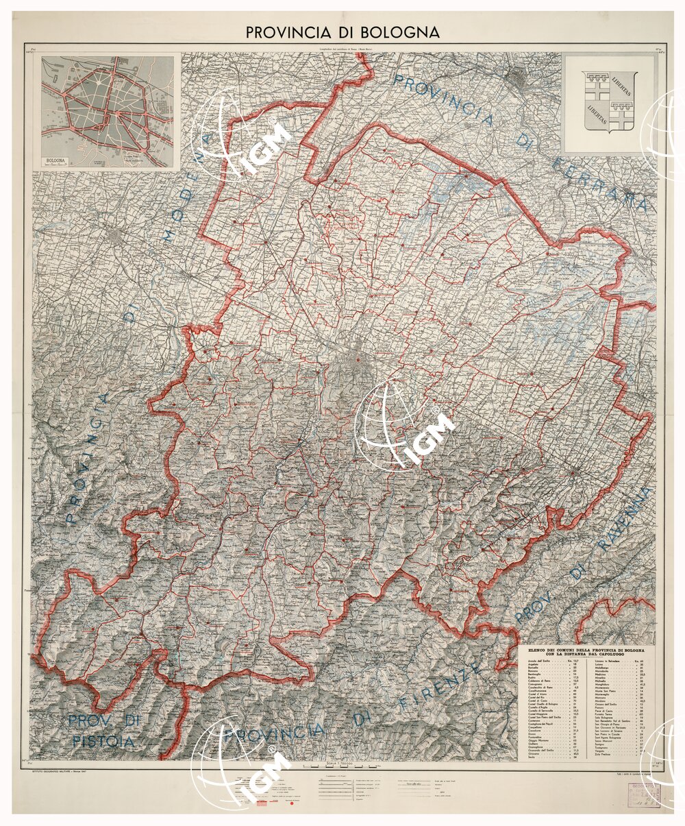 | Note foto | Autore I.G.M. (FI). Rappresentazione orografica a curve di livello e sfumo. Tipo di stampa policroma. Questa carta contiene in dettaglio la mappa di Bologna. |