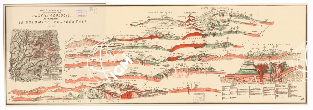 Sotto al titolo è presente lo “Schizzo geomorfologico della piattaforma porfirica atesina e delle dolomiti occidentali”. Silvio Vardabasso: R. Scuola d’Ingegneria, Padova. Stabilimento Cartografico G. Giardi (FI)