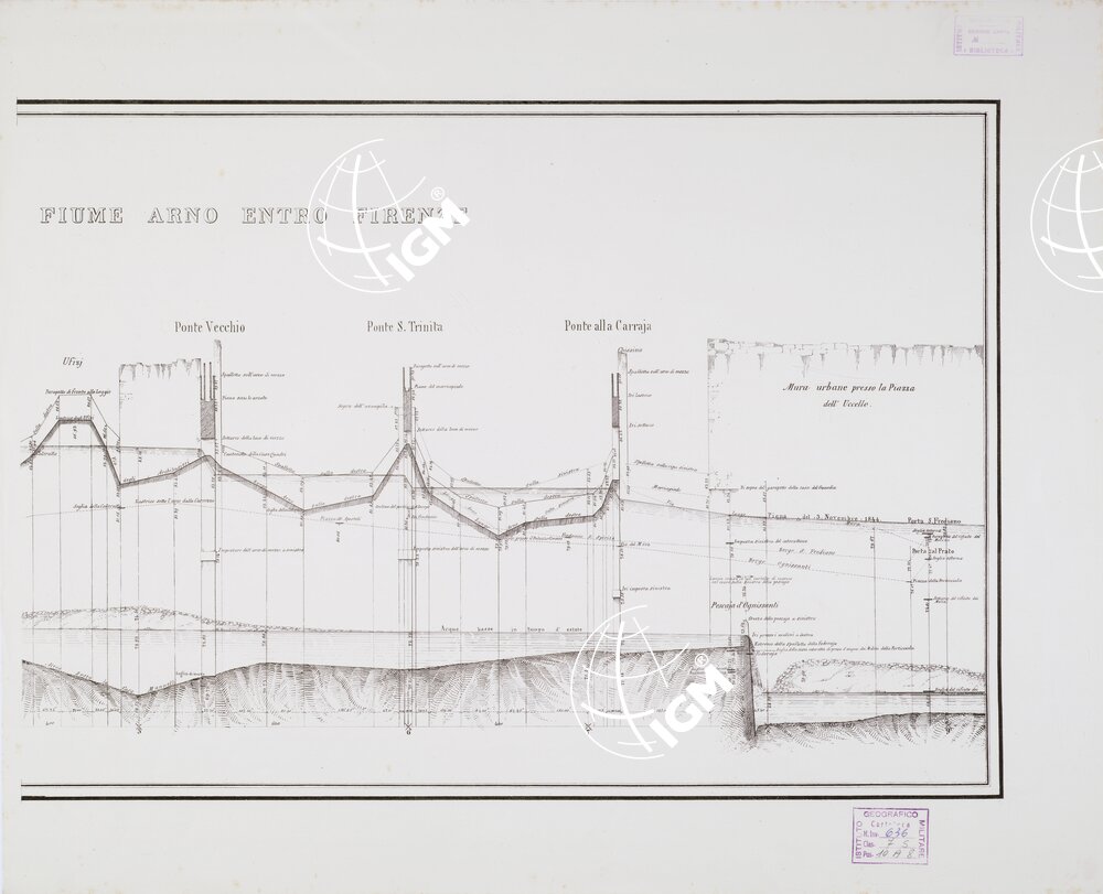 PROFILO DI LIVELLAZIONE DELLA CHIANA E DELL'ARNO DALL'ARGINE DI SEPARAZIONE PRESSO CHIUSI SINO AL MARE E DELLA SIEVE DA S. PIERO A SIEVE SINO AL SUO SBOCCO IN ARNO – FOGLIO 3 – Profilo longitudinale del fiume Arno entro Firenze – parte 2