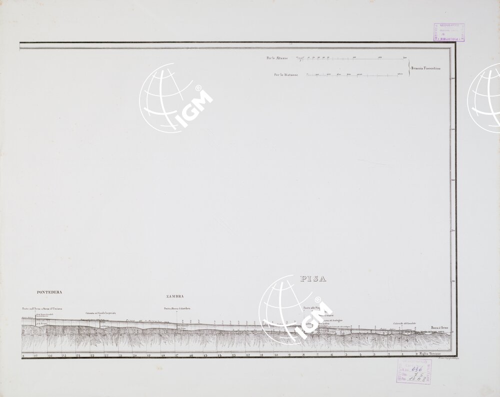 PROFILO DI LIVELLAZIONE DELLA CHIANA E DELL’ARNO DALL’ARGINE DI SEPARAZIONE PRESSO CHIUSI SINO AL MARE E DELLA SIEVE DA S. PIERO A SIEVE SINO AL SUO SBOCCO IN ARNO – FOGLIO 8 – Pisa