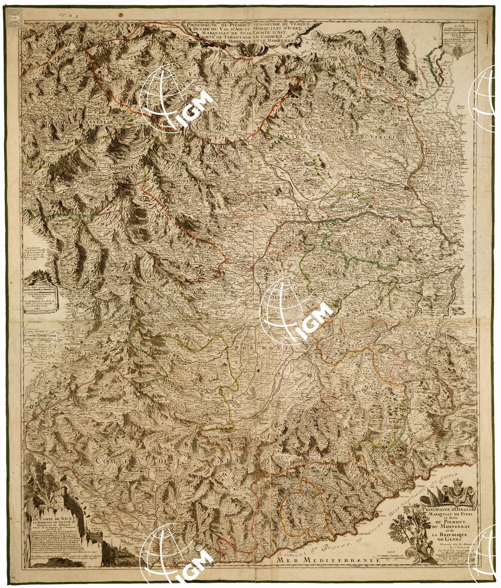 Due legende avvertono che Contea di Nizza, Marchesato di Saluzzo, Principato di Monaco, Principato di Oneglia, Marchesato di Finale e parte del Piemonte e della Repubblica di Genova, sono costruiti in base alle memorie del Sig. Bourgoin, da N. de Fer e aumentate su i migliori materiali da I. F. Benard. Incisore N. Guerard.