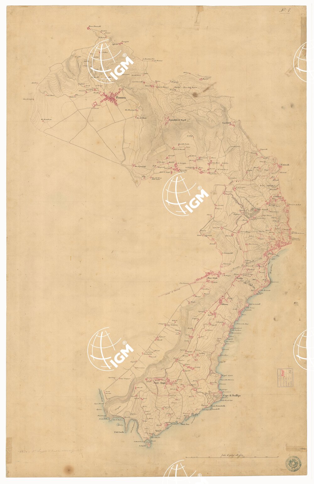 Documento n. 51. Disegno originale a colori. E’ il primo saggio di rilevamento a curve orizzontali eseguito nel R.le Officio Topografico di Napoli nel 1830 mediante un sistema misto di profili e triangolazioni grafiche. (Cfr. Firrao C., Sull’Officio Topografico di Napoli. Origini e vicende, 1868).