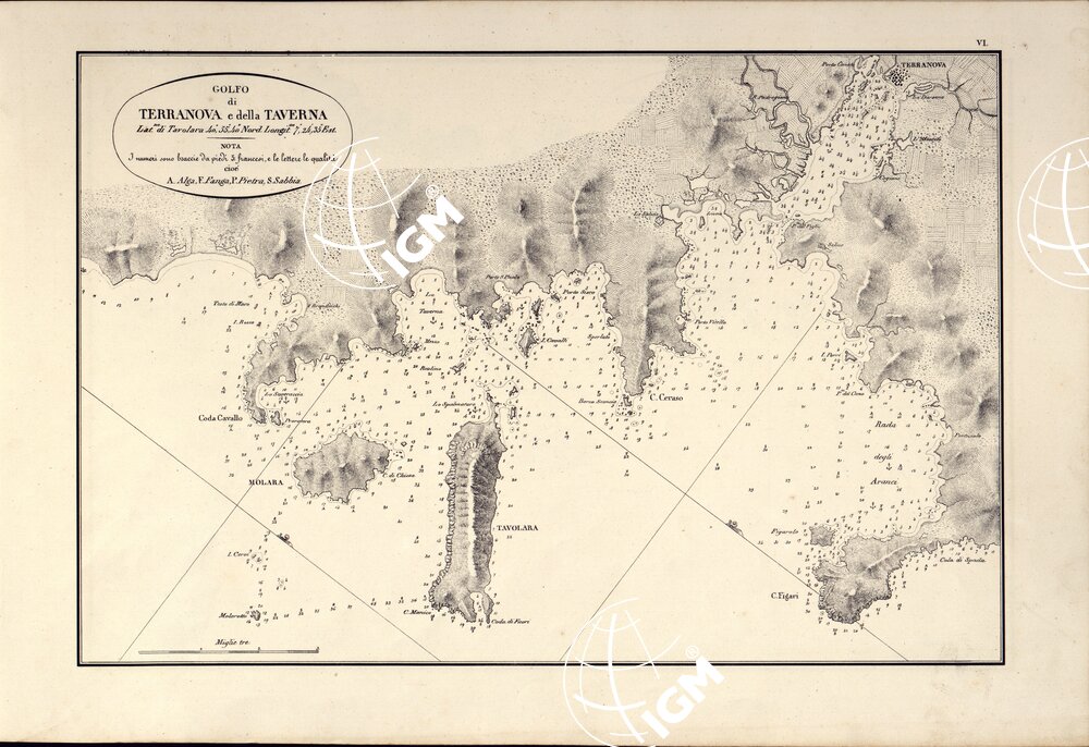 PORTOLANO DELLA SARDEGNA – CARTA IDROGRAFICA DELLA SARDEGNA LEVATA DAL CAVALIERE GIUSEPPE ALBINI CAPITANO DI VASCELLO NELLA MARINA DI S.M. SARDA – GOLFO DI TERRANOVA E DELLATAVERNA TAVOLA VI.