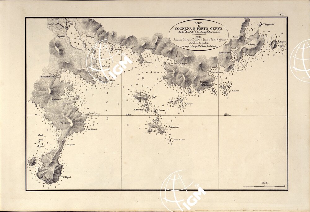 PORTOLANO DELLA SARDEGNA – CARTA IDROGRAFICA DELLA SARDEGNA LEVATA DAL CAVALIERE GIUSEPPE ALBINI CAPITANO DI VASCELLO NELLA MARINA DI S.M. SARDA – GOLFO DI COGNENA E PORTO CERVO TAVOLA VII.