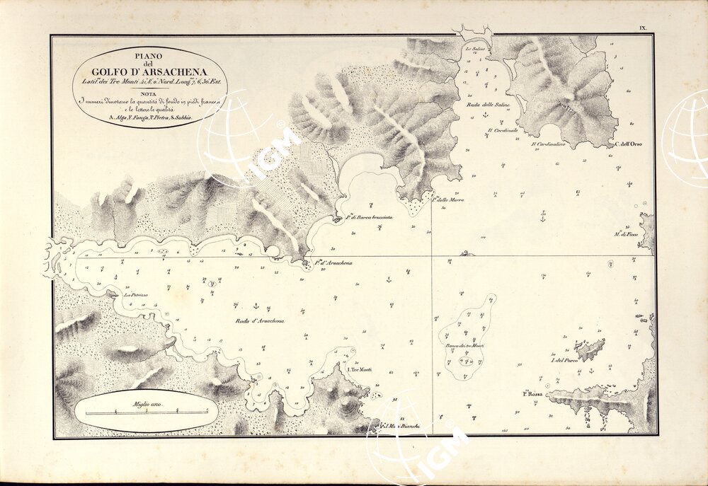 PORTOLANO DELLA SARDEGNA – CARTA IDROGRAFICA DELLA SARDEGNA LEVATA DAL CAVALIERE GIUSEPPE ALBINI CAPITANO DI VASCELLO NELLA MARINA DI S.M. SARDA – PIANO DEL GOLFO D'ARSACHENA TAVOLA IX.