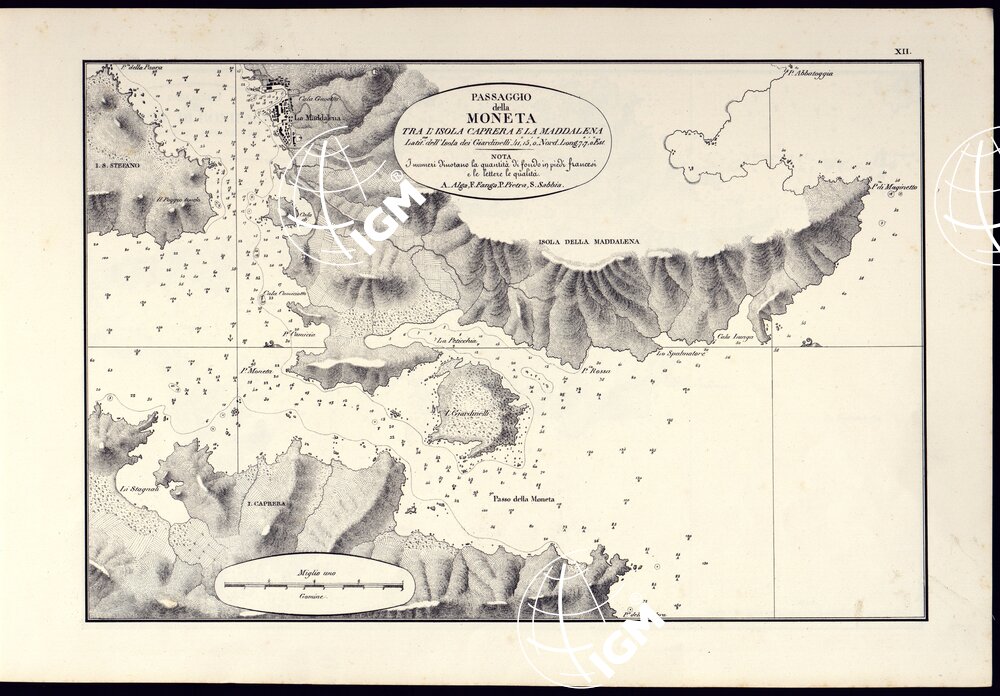 PORTOLANO DELLA SARDEGNA – CARTA IDROGRAFICA DELLA SARDEGNA LEVATA DAL CAVALIERE GIUSEPPE ALBINI CAPITANO DI VASCELLO NELLA MARINA DI S.M. SARDA – PASSAGGIO DELLA MONETA TRA L'ISOLA CAPRERA E LA MADDALENA TAVOLA XII.