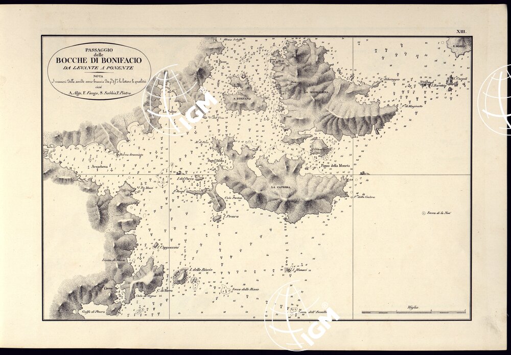 PORTOLANO DELLA SARDEGNA – CARTA IDROGRAFICA DELLA SARDEGNA LEVATA DAL CAVALIERE GIUSEPPE ALBINI CAPITANO DI VASCELLO NELLA MARINA DI S.M. SARDA – PASSAGGIO DELLE BOCCHE DI BONIFACIO DA LEVANTE A PONENTE TAVOLA XIII.