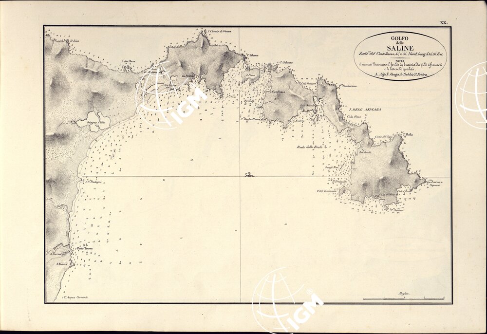 PORTOLANO DELLA SARDEGNA – CARTA IDROGRAFICA DELLA SARDEGNA LEVATA DAL CAVALIERE GIUSEPPE ALBINI CAPITANO DI VASCELLO NELLA MARINA DI S.M. SARDA – GOLFO delle SALINE TAVOLA XX.