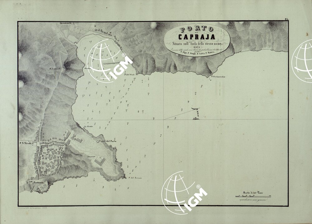 Album contenente 24 tavole incise su pietra. L’orografia del terreno costiero è rappresentata mediante tratteggio. Gli scandagli sono calcolati in braccia di piedi francesi. Scale grafiche in tese. L’album è presentato dal Vice Amm. nella R. Marina G. Albini. Due copie.