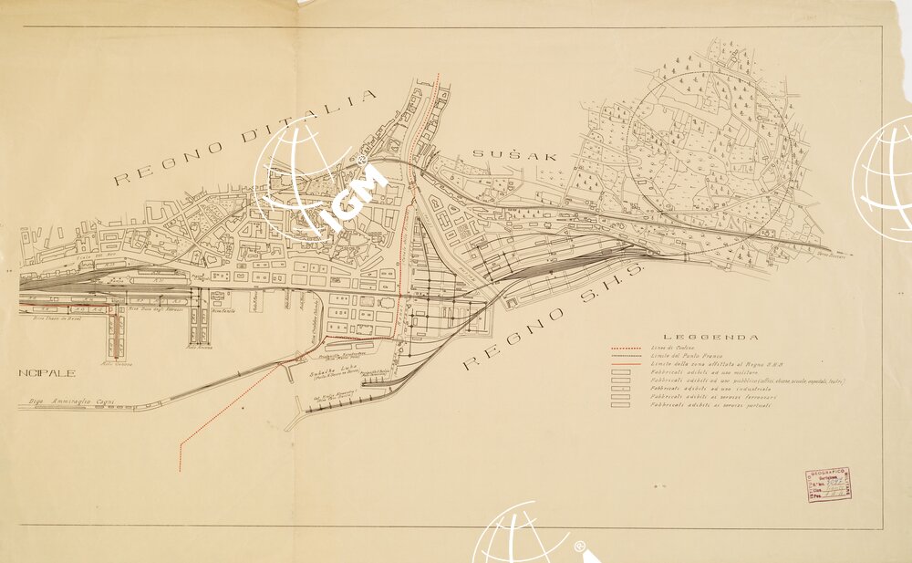 | Note foto | Due fogli stampati in nero con indicati in rosso la linea di confine e il limite della zona affittata al Regno S. H. S. I.G.M. |