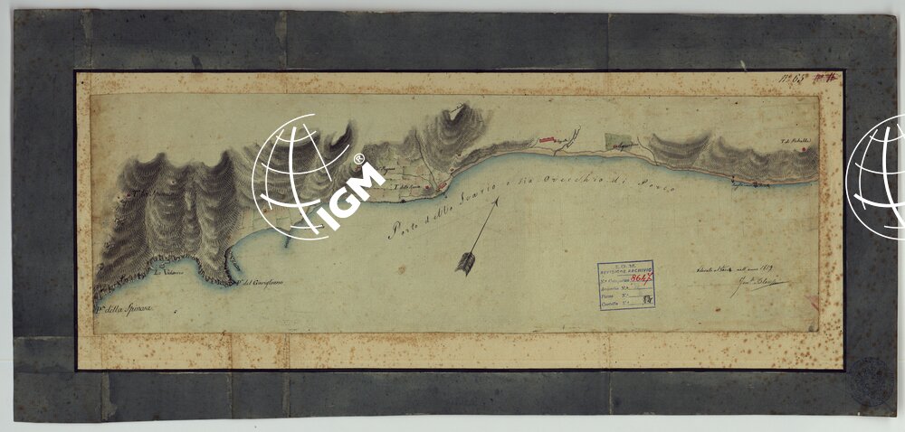 Documento n. 54. Rilievo originale a colori eseguito nel 1819 dal Ten. Blois con orografia a tratteggio.