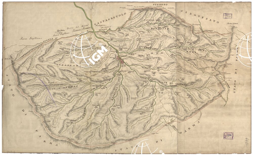 Epoca fine del secolo XVIII. Scala 1:27.000 circa. Carta manoscritta, senza titolo, autore nè data. Rappresenta il territorio di Pontremoli fino ai confini dello Stato di Parma e del Genovesato. E´ orientata col nord invertito al basso. L´orografia è rappresentata schematicamente con tratteggio. Gli abitati sono rappresentati con torri e case, centro Pontremoli che è in pianta. Sono tracciate le strade. Le acque sono colorate in verde.