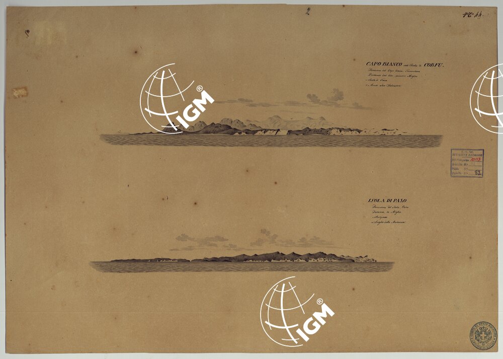 Docum. 78-1. Due tavole ad acquerello senza data, nè firma. Contengono vedute delle Isole Tremiti e dell’Isola di Corfù e dell’Isola di Paxo. Le tavole di questo documento, come pure dei Docum. 75-76 – numero di Categorico 9250 e il Docum. 77 – numero di Categorico 10112 -, si riconnettono ai lavori eseguiti dal 1817 al 1819 dagli ufficiali austriaci dell’Ist. Geografico di Milano per la Carta Idrografica dell’Adriatico e delle isole Ionie; il lavoro venne eseguito con il concorso dell’Officio Topografico di Napoli sotto la guida del Col. Visconti e del Cap. inglese W. Smyth. (Cfr. Firrao C., “Sull’Officio Topografico di Napoli, Origini e vicende, 1868”.