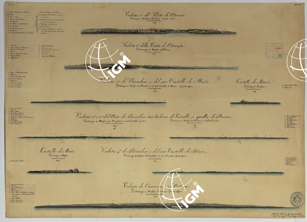 Docum. 75 -Tav. 53-1) Castello di Castro, Otranto, Capo di Leuca; Docum. 75 -Tav. 54-2) Monte Gargano, Saline e Costa di Barletta, Castello di Brindisi, Torre di Penne e Castello di Brindisi; Docum. 75 -Tav. 55-3) Capo di Otranto, Capo di S. Maria di Leuca, Costa d’Albania; Docum. 76 -Tav. 56-1) Capo di S. Maria di Leuca, Veduta della Costa tra Castro ed Otranto, Porto di Vadisco, Costa d’Albania; Docum. 76 -Tav. 57-2) Porto e Costa di Otranto, Porto di Brindisi e il Castello, Carovigno ed Ostuni; Docum. 76 -Tav. 58-3) Barletta, Monte Gargano. Le tavole di questo documento, come pure dei Docum. 78-1 e 78-2 – numero di Categorico 10113 e il Docum. 77 – numero di Categorico 10112 – si riconnettono ai lavori eseguiti dal 1817 al 1819 dagli ufficiali austriaci dell’Ist. Geografico di Milano per la Carta Idrografica dell’Adriatico e delle isole Ionie; il lavoro venne eseguito con il concorso dell’Officio Topografico di Napoli sotto la guida del Col. Visconti e del Cap. inglese W. Smyth. (Cfr. Firrao C., “Sull’Officio Topografico di Napoli, Origini e vicende, 1868”.